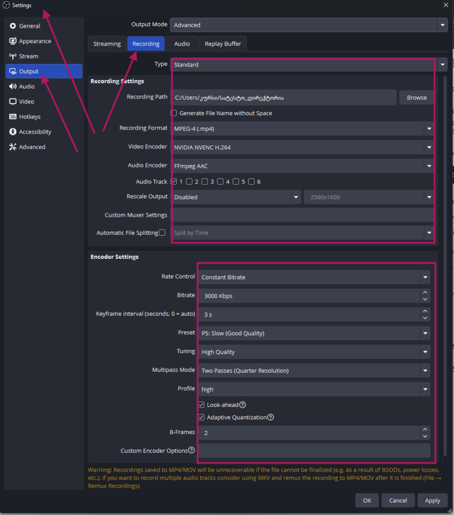 ვიდეოს ჩაწერისას (Settings > Output > Recording) მიუთითეთ: